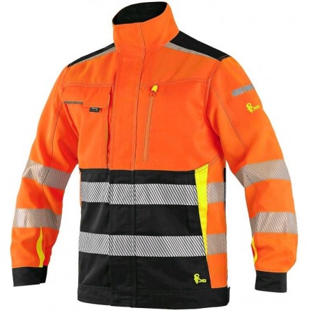 Pánská výstražná blůza, ramena zesílena materiálem CORDURA, rukávy s nastavitelnou manžetou na suchý zip, kryté zapínání na zip, suché zipy a druky, levá náprsní kapsa na zip, pravá krytá klopou, na levém rukávu kapsička na tužky, boční kapsy na zip, segmentované reflexní pásky (šíře 5 cm), kontrastní oranžové a reflexní doplňky. Doporučené použití: stavebnictví, silničáři, údržba, logistika, letecká a lodní doprava. Základní materiál: satén 60 % bavlna 40 % polyester, Doplňkový materiál: kepr 60 % bavlna 40 % polyester, gramáž 280g/m2. Norma EN ISO 20471. Typy barevného provedení: žluto-černá, oranžovo-černá. Velikost 48-60. Barva žluto-černá ve velikosti 48-68.