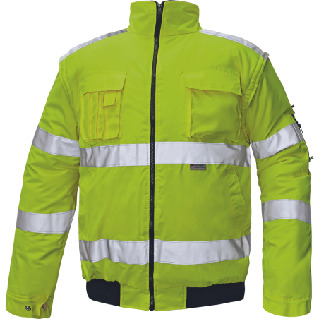 Pánská HI-VIS zimní nepromokavá bunda s odepínatelnými rukávy; kapuce integrovaná v límci, prodyšná, podlepené švy; 3M reflexní pruhy okolo pasu a rukávů; 2 boční kapsy, 2 náprsní kapsy, 1 malá kapsa na levém rukávu; nastavitelná šířka rukávů pomocí druků; elastický pas. Norma EN ISO 13688, EN 342 ( ...