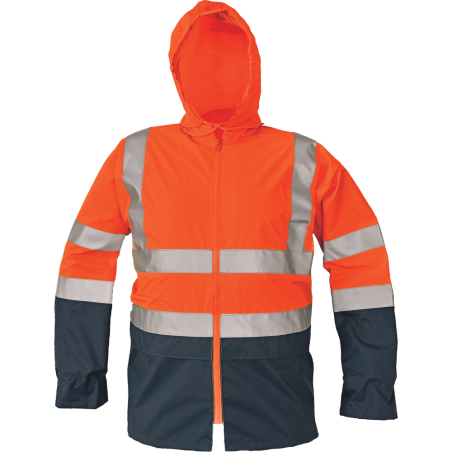 Pánská HI-VIS bunda bez podšívky s kapucí skrytou v límci, podlepené švy; vysoká voděodolnost, paropropustná; reflexní 3M pruhy přes ramena, po obvodu boků a rukávů; 2 velké přední kapsy kryté klopou; spodní lem bundy a kapuce stažitelná na tkaničku. Norma EN ISO 13688, EN 343 (31), EN ISO 20471 (Class: 2). Svrchní materiál: 100 % polyester, Povrstvení: polyuretan. Barva: žlutá, oranžová. Velikosti: S-3XL